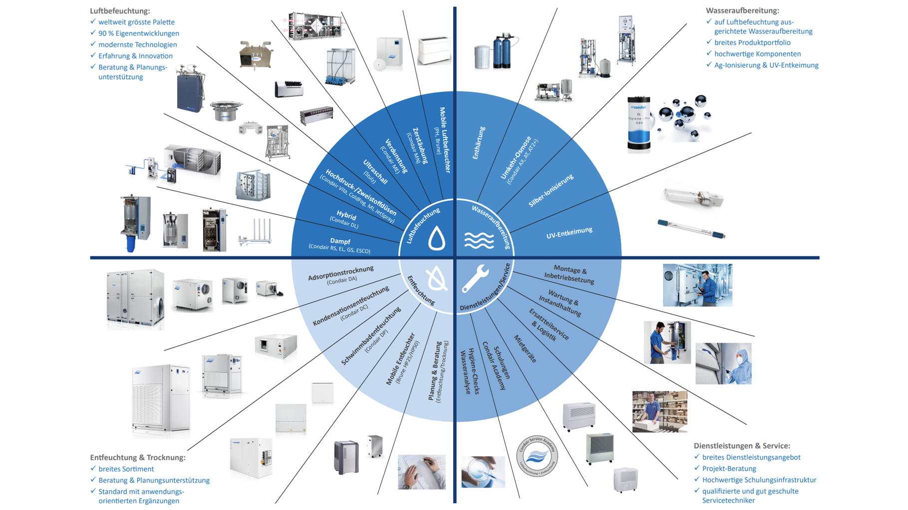Wir sind Ihr Partner für Lösungen der Luftbefeuchtung, Entfeuchtung und Trocknung und bieten Ihnen auch unsere Dienstleistungen über den gesamten Produktlebenszyklus an!