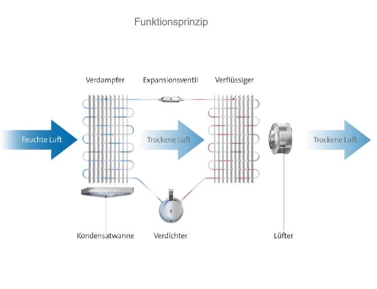 Der Prozess der Luftentfeuchtung basiert in diesem Fall auf einem Kälteprozess. Dabei wird von der Kältemaschine eine niedrige Temperatur erzeugt, durch die der Wasserdampf aus der Luft kondensiert und die Luft somit entfeuchtet wird.