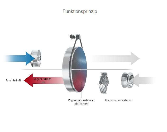 Bei einem Adsorptionstrockner besteht das Sorptionsmaterial meist aus einem hoch hygroskopischen Silikagel, welches fest in einem, sich langsam drehenden Rotor eingebettet ist, der kontinuierlich zwischen zwei getrennten, gegenläufigen Luftströmen rotiert. Im Adsorptionsbereich des Rotors wird der feuchte Luftstrom getrocknet. Im Regenerationsbereich wird die im Sorptionsmaterial gespeicherte Feuchtigkeit durch den heissen Luftstrom ausgetrieben und von diesem wieder aufgenommen. Da das Funktionsprinzip auf Sorption, also einem weitgehend temperaturunabhängigen Prozess und nicht etwa auf Kondensation beruht, sind Adsorptionstrockner besonders bei tiefen Temperaturen zu empfehlen. Zudem lassen sich durch Adsorptionstrockner auch besonders niedrige Feuchtewerte erreichen.