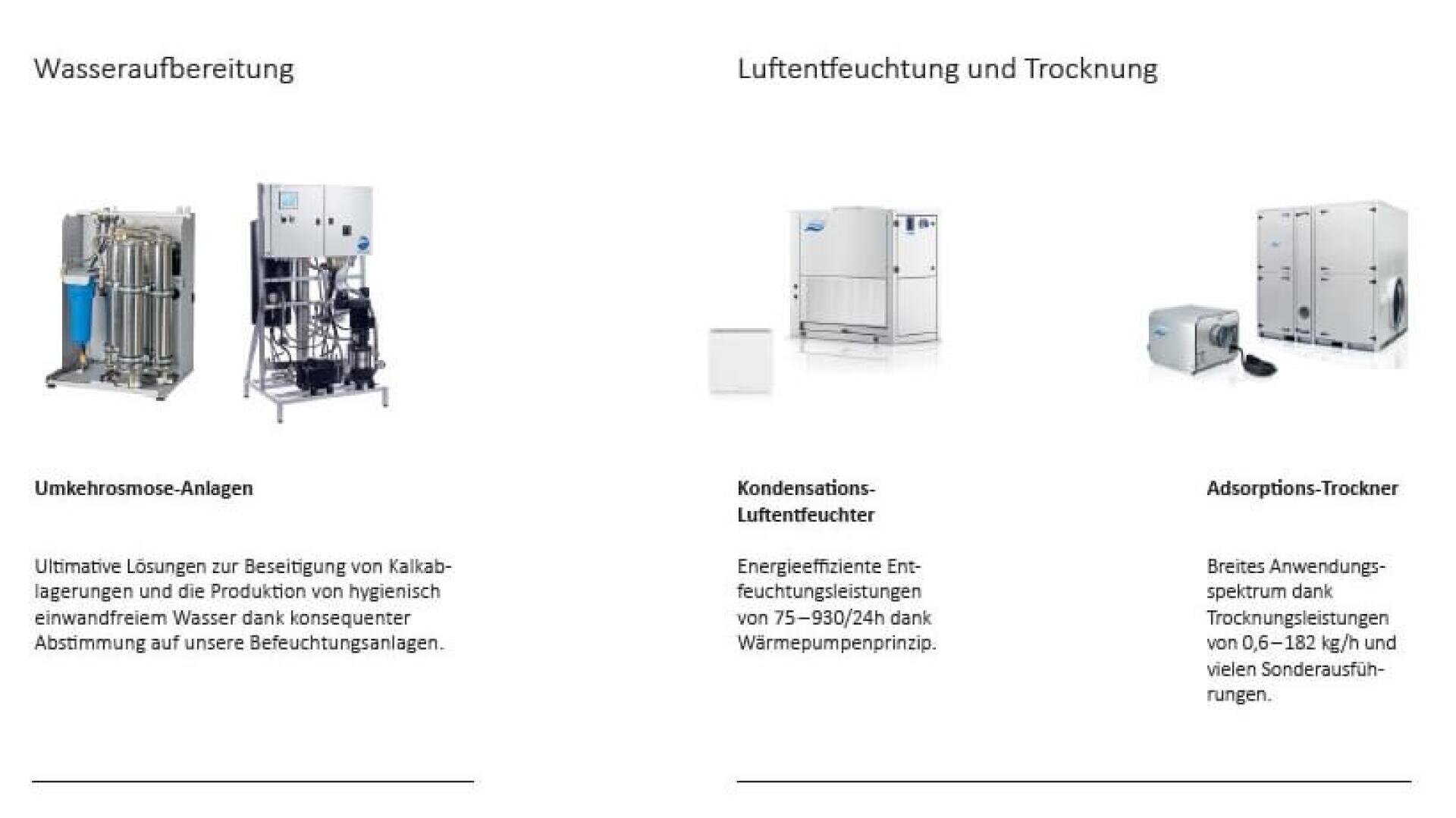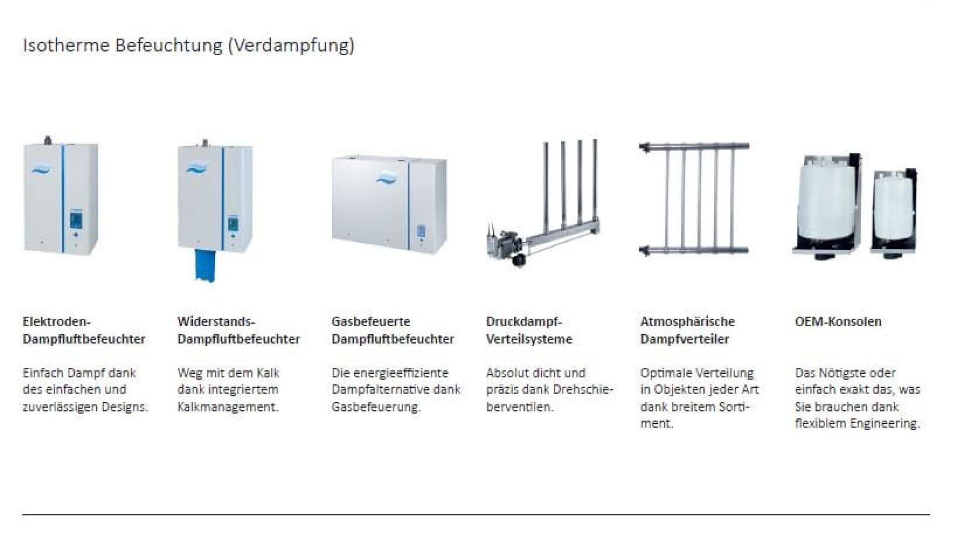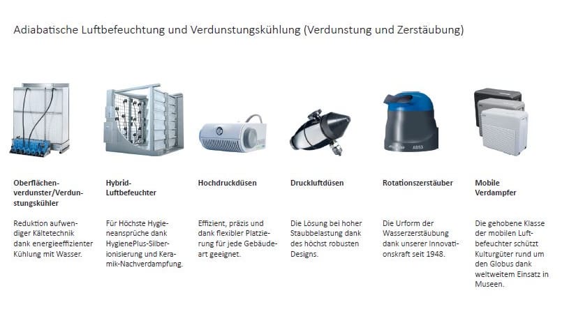 in den Bereichen Luftbefeuchtung, Entfeuchtung, Trocknung und Verdunstungskühlung und verfügt über ein umfangreiches Portfolio an Produkten und Services. Aufbauend auf unserer langjährigen Erfahrung und Expertise sorgen wir mit unseren Lösungen für das ideale Raumklima – bei geringem Energieverbrauch und Schonung der Umwelt. Dieser ganzheitliche Ansatz wird in Zukunft immer mehr an Bedeutung gewinnen. Aus diesem Grund erfüllt es uns mit grossem Stolz, dass wir schon jetzt optimal auf künftige Herausforderungen vorbereitet sind.