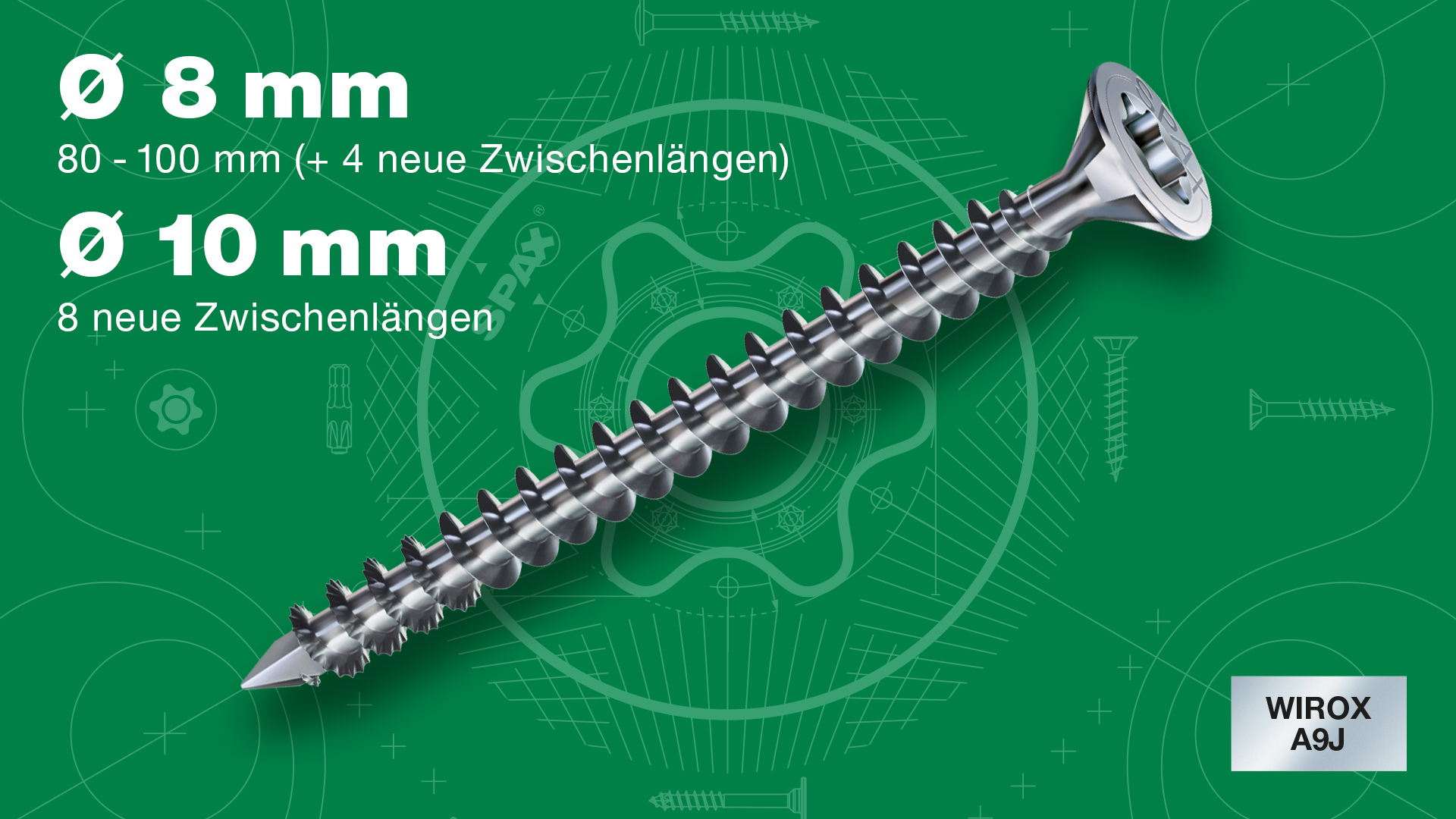 und neue Zwischenlängen 8 x 325 mm, 8 x 375 mm, 8 x 425 mm und 8 x 475 mm - SPAX Senkkopfschraube Vollgewinde WIROX mit 10 mm Gewinde-Ø
