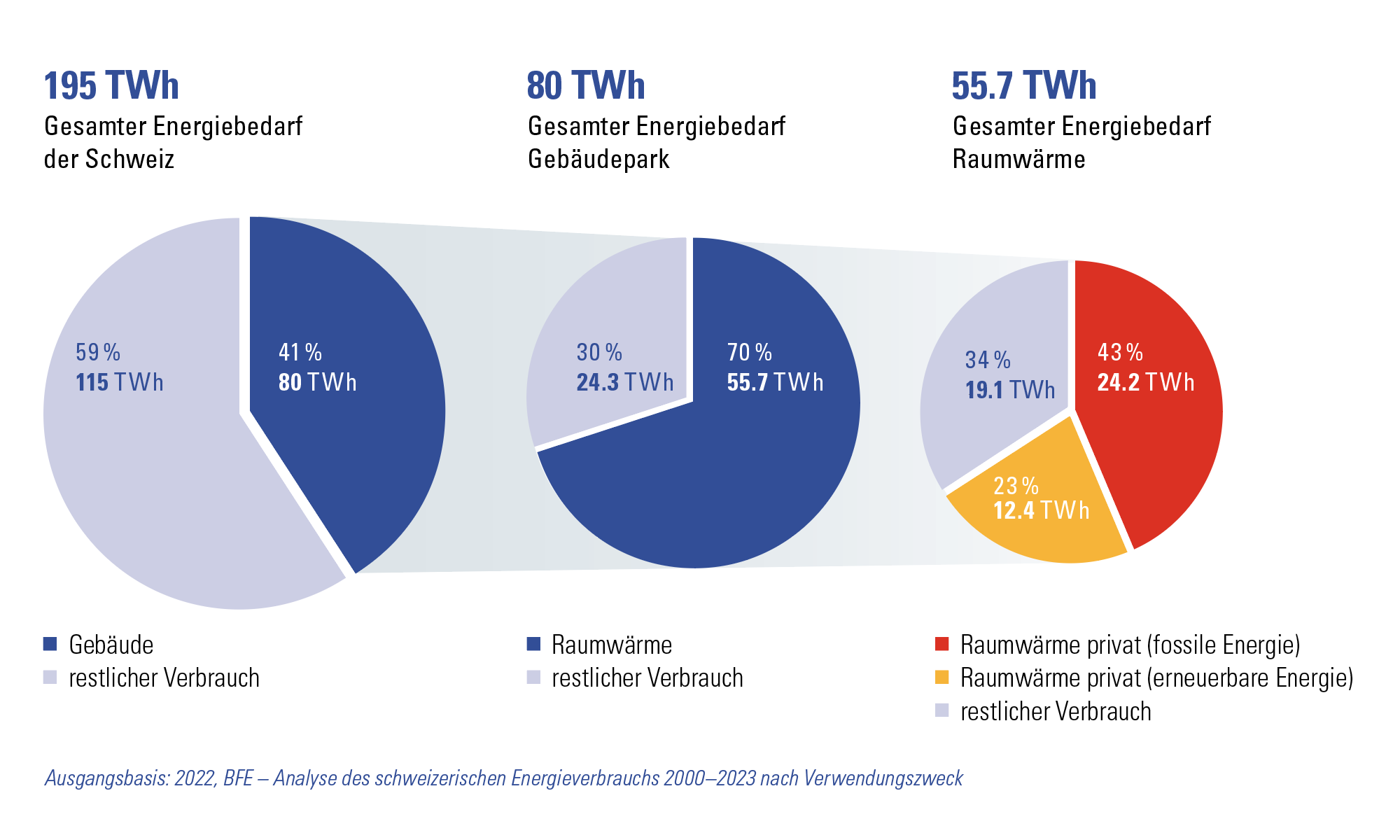 Der Einfachheit halber wurde die Annahme getroffen, dass alle Öl-, Gas- und Elektroheizungen durch Wärmepumpen ersetzt werden. Daraus resultiert ein Stromverbrauch von 11.5 TWh. Wird zusätzlich die Gebäudehülle gedämmt, sinkt dieser auf 6.2 TWh – eine Reduktion um 5.3 TWh. Dies entspricht rund 10 % des jährlichen Stromverbrauchs der Schweiz oder dem jährlichen Stromverbrauch der Kantone St. Gallen und Graubünden zusammengerechnet. Da Wohnbauten nur zwei Drittel des Gebäudeparks ausmachen, liegt das Einsparpotenzial gesamthaft noch höher.