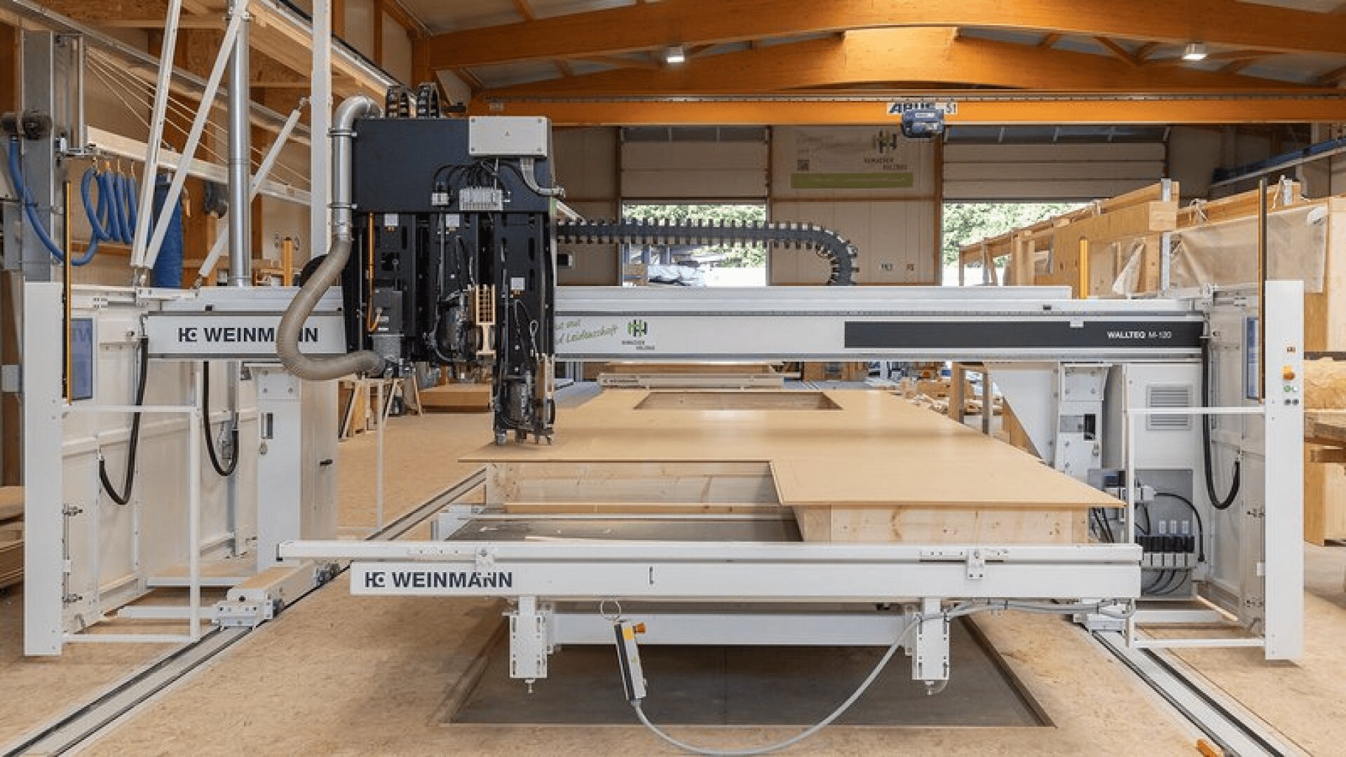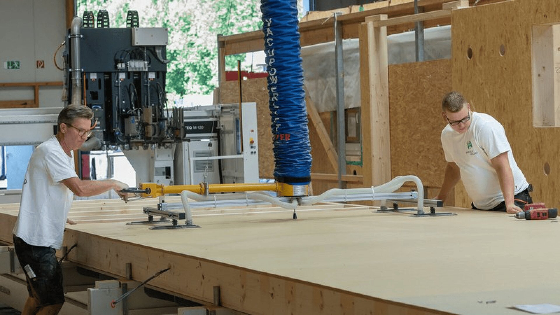 Anfang 2021 ging man auf Tobias Klein von Weinmann Holzbausystemtechnik zu. Das Unternehmen hatte einen langen Auftragsvorlauf, die Nachfrage stieg kräftig: „Wir bekamen zwar immer noch problemlos neue Mitarbeiter, aber es war klar, dass wir effektiver werden mussten. So haben wir uns mit Tobias Klein zusammengesetzt und eine Fertigungslinie mit einer WALLTEQ M-120 projektiert.“ Die halbautomatische Zimmermeisterbrücke arbeitet in Overath an zwei BUILDTEQ A-530 Aufstelltischen, Wandelemente werden mit dem Hallenkran zwischen den Tischen weitertransportiert: Eine im Dialog mit Weinmann auf den vorhandenen Platz abgestimmte, kostengünstige Einstiegslösung, für die man sich bei Hamacher bereits spätere Updates vorstellen kann. Denn die Erfahrungen mit der neuen Technik sind rundum positiv: „Wir haben in der Fertigung eine deutliche Kapazitätssteigerung“, erläutert Florian Hamacher. „Die Zahl der Elemente, die pro Mitarbeiter produziert werden, ist enorm gestiegen, und auch unsere Bauteilqualität ist durch die automatisierte Fertigung definitiv besser geworden. Wir merken das unter anderem auf der Baustelle, wo die Elemente in höherem Vorfertigungsgrad ankommen und passgenauer sind.“ Das spart etwas Zeit in der Montage, der Löwenanteil der Zeitersparnis liegt für Florian Hamacher aber in der Produktion selbst: „Hier sprechen wir über Zeitgewinne zwischen 35 und 65 Prozent. Unter dem Strich können wir also heute deutlich mehr Häuser bauen, und auch bei Großaufträgen, bei denen man in einem kleinen Zeitfenster viel produzieren muss, zahlt sich die Automatisierung aus.“ Sie rechnet sich auch finanziell: Die Amortisationszeit für die gesamte Umstrukturierung inklusive flankierender Maßnahmen wie einem neuen Stromanschluss, zwei Säulenkränen mit Vakuumhebern, einem neuen Kompressor und einer neuen Absauganlage liegt bei erfreulich kurzen zwei bis vier Jahren. Eine Förderung vom Bund gab es noch oberdrauf: Das Bundesministerium für Ernährung und Landwirtschaft bewilligte für die Modernisierung einem Zuschuss von 20 Prozent.