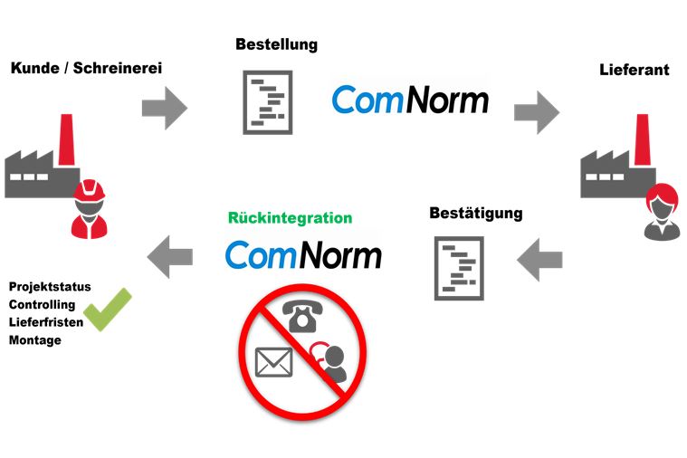 In vielen Schreinereien werden über die ComNorm ausgeführte elektronische Bestellungen manuell mit der Auftragsbestätigung in Papierform verglichen. Abweichungen, etwa bei den Stückzahlen oder Lieferterminen, muss man mühsam suchen. Solch zeitraubende Kontrollen sind heute nicht mehr erforderlich. Denn der komplette Prozess von der Bestellung bis zum Rechnungseingang inklusive Freigeben in die Buchhaltung lässt sich digitalisieren.