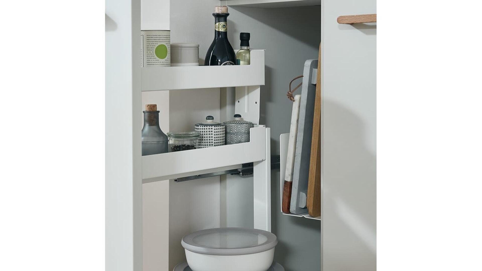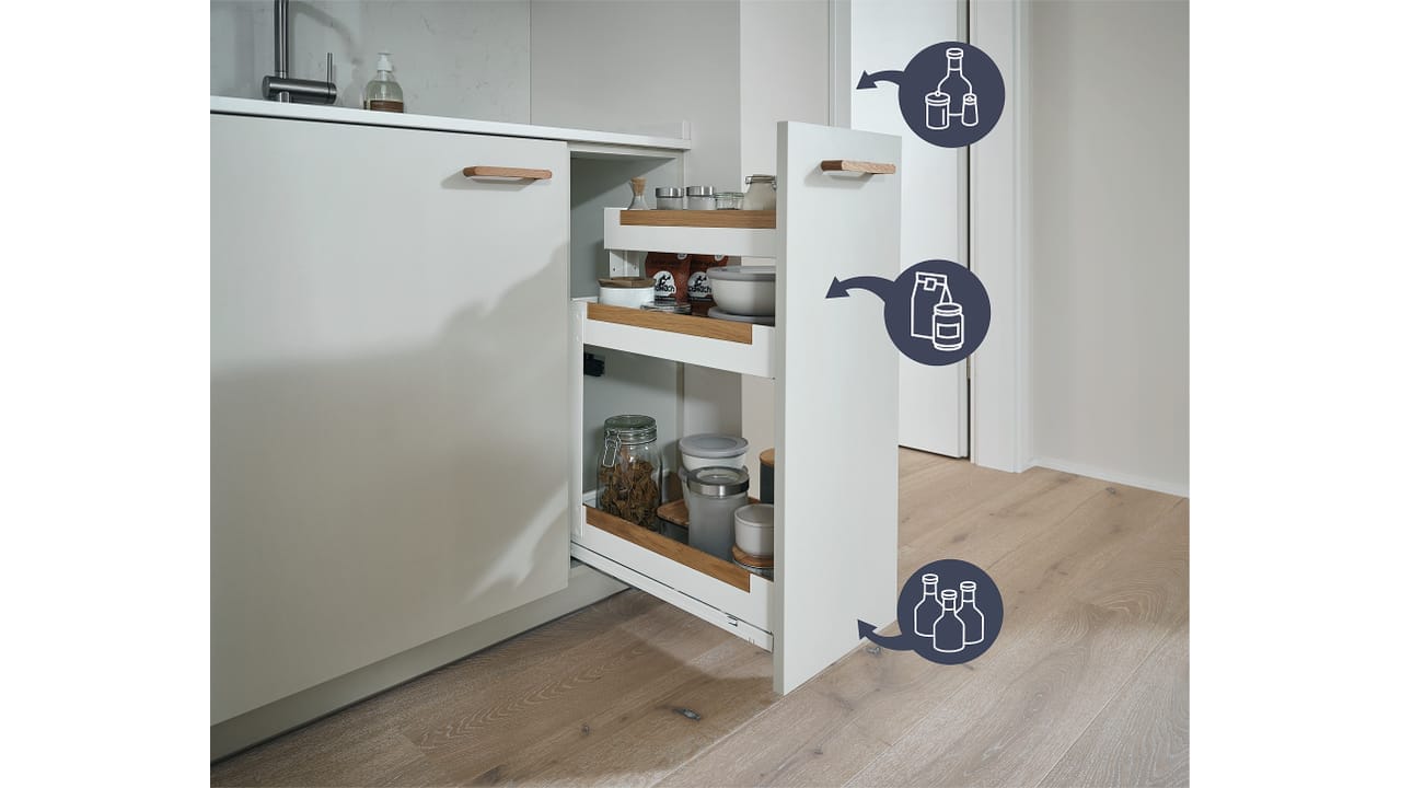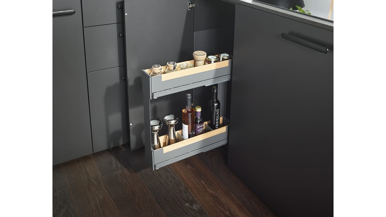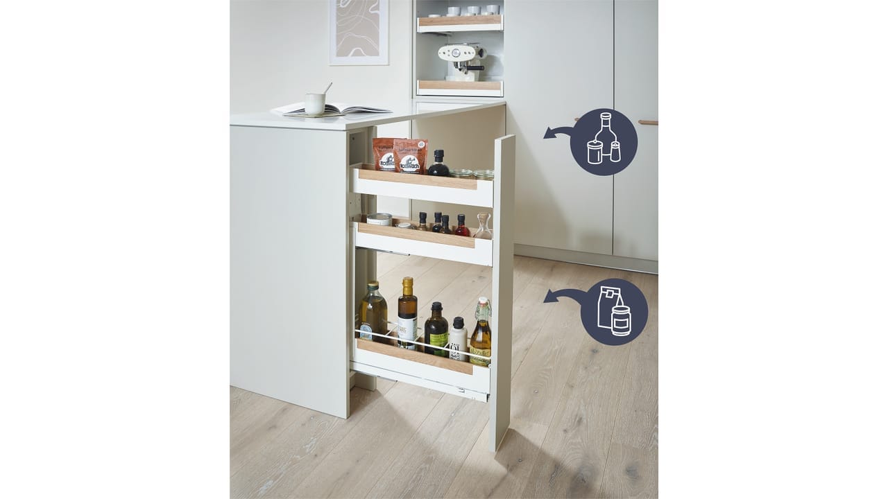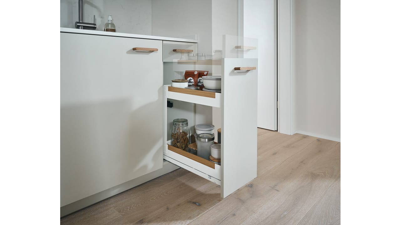 Pinello Spice est une extension pour condiments tout en finesse rentrant dans un élément de 150 mm de large. Conçu pour des largeurs de 200 et 300 mm, Pinello Cargo est le modèle gros format offrant un espace de rangement incroyable. Pinello Towel a été développé comme extension porte-serviettes et Pinello Board comme extension permettant d’accéder facilement aux planches et plaques. Pinello Bread constitue l’extension à pain pour toute la famille. Enfin, une extension intérieure pure est aussi vendue avec Pinello Inside.