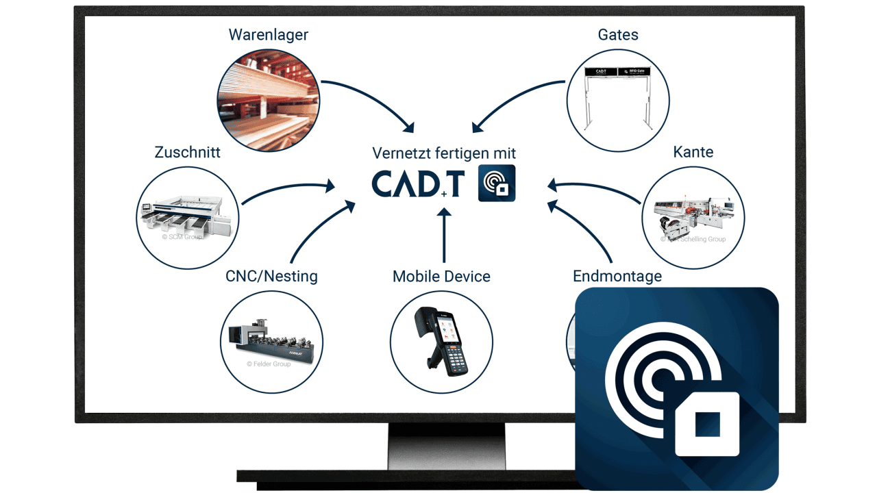 - RFID - Profitez du dernier développement de CAD+T, le suivi des pièces sans contact. Grâce à la technologie RFID, il détecte la présence, l'absence et l'étape d'assemblage de toutes les pièces nécessaires à l'exécution d'une commande, tout en identifiant les écarts de plan et en mesurant les processus de production individuels pour un suivi des pièces sans erreur et des systèmes de production connectés.